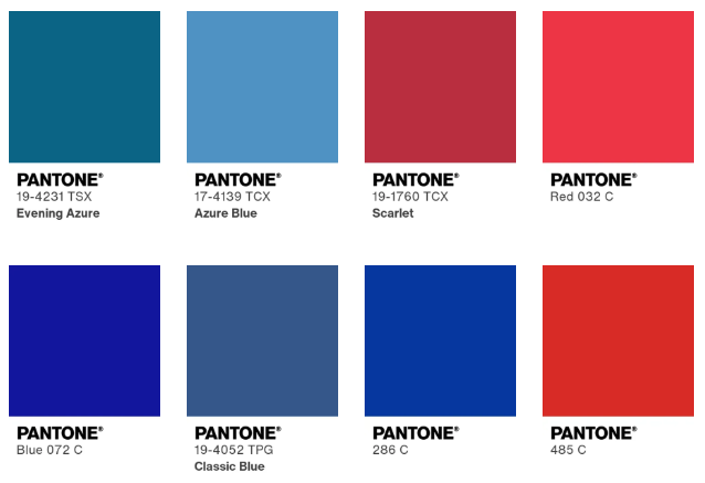 Putting these colour names into the Pantone Matching System, yields the following results; (The current Government of Russia orders their flags using Pantone colours, Pantone 286C for blue, and Pantone 485C for red. I have also included the named Red, Blue and Classic Blue from Pantone for reference.)